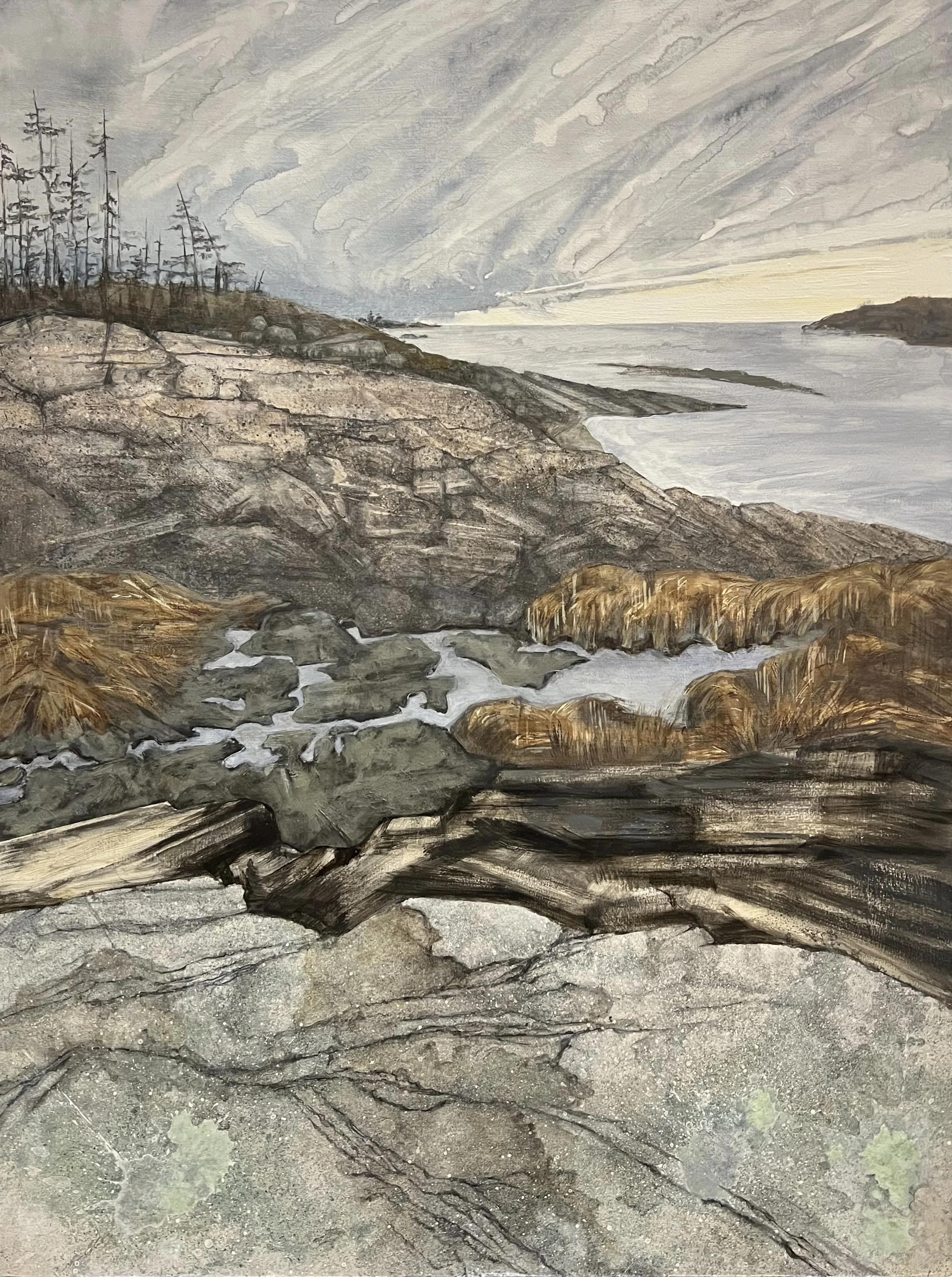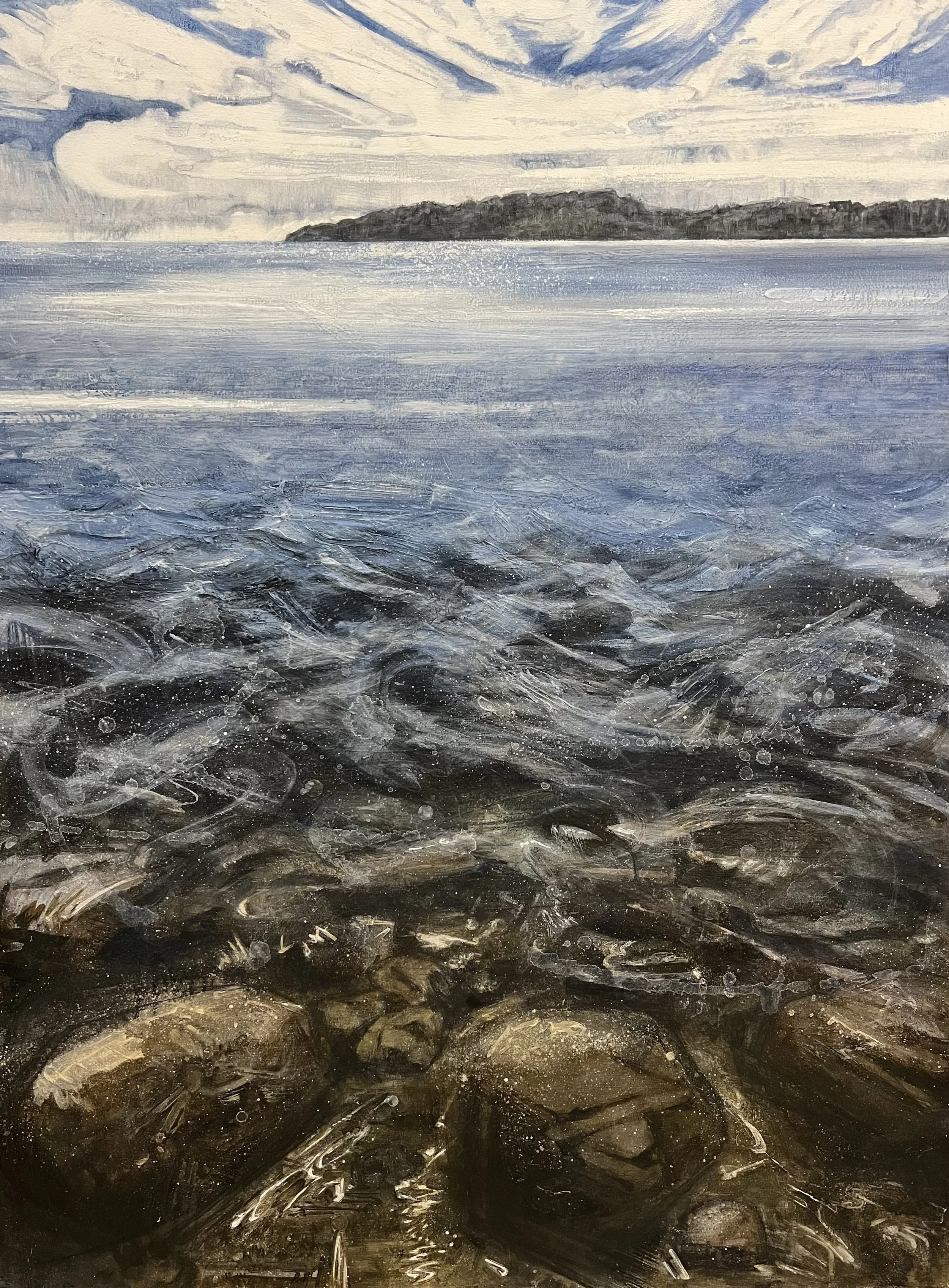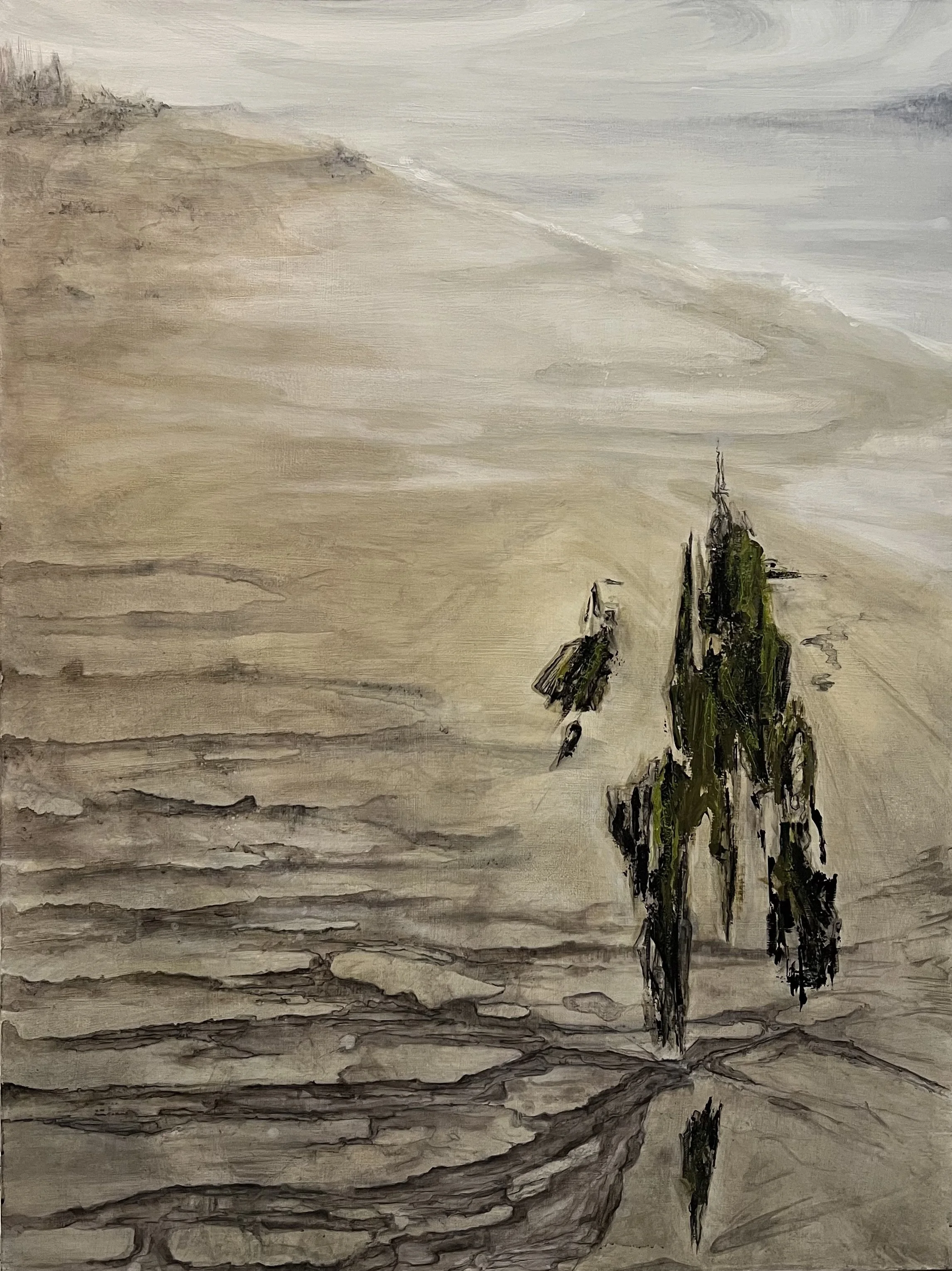 This body of work explores various stages of the waning tide, across a range of atmospheric moods. As the water pulls out of view, I attempt to tug at and isolate that which remains, examining the stark contrast of textures and subtle shifts of color that sometimes resonate, and at other times conflict.